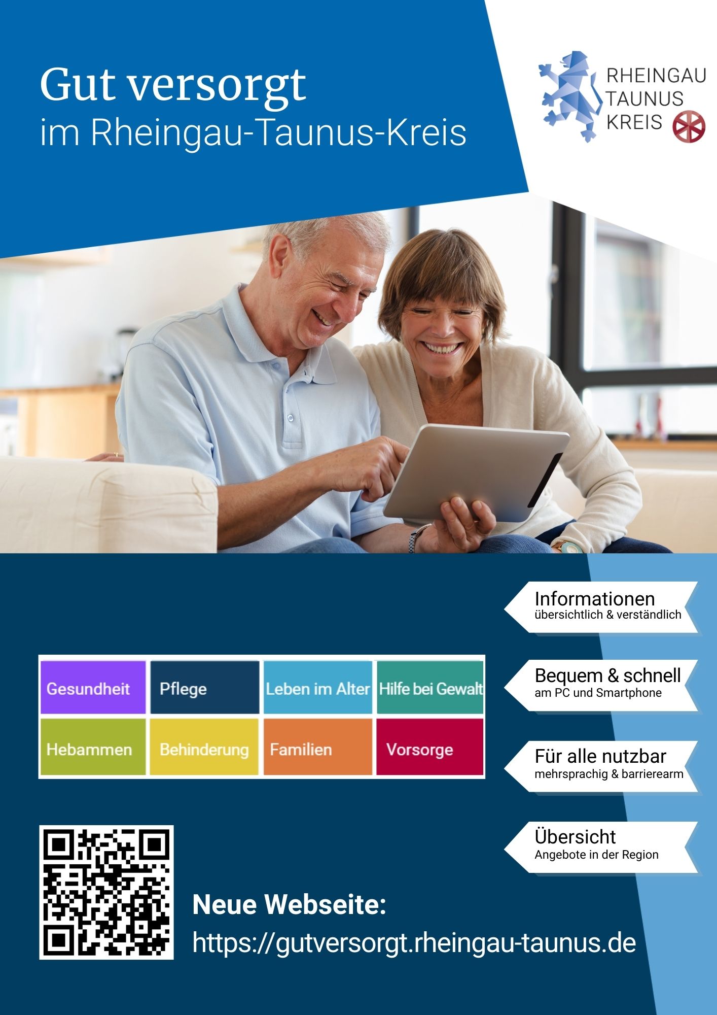 Herzlich willkommen auf der Informationsplattform „Gut versorgt im Rheingau-Taunus-Kreis“. Diese Webseite bietet Ihnen einen umfassenden Überblick über alle wichtigen Themen rund um Gesundheit, Pflege, Leben im Alter, Inklusion, Familie und Prävention im Rheingau-Taunus-Kreis.