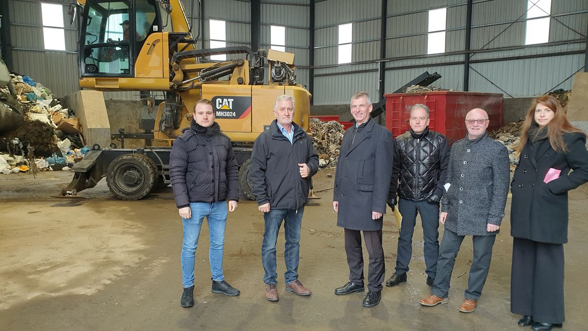 Die Halle für die Mülltrennung stößt an ihre Kapazitätsgrenze, weshalb eine Erweiterung des Betriebsgeländes der Firma Arbter Transporte und Containerdienst GmbH erfolgen soll: Die Geschäftsleiter Bernd (2. von links) und Florian Arbter (links) stellen Landrat Frank Kilian (3. von links), Michael Krebs, Achim Staab und Jennifer Brötz (von links nach rechts) von der Kreisverwaltung die Pläne vor.