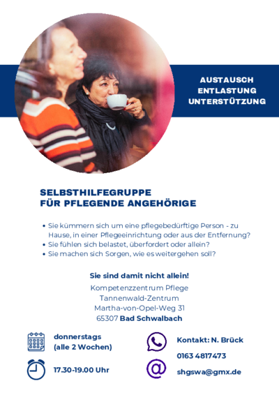 Wer einen nahestehenden Menschen pflegt, leistet tagtäglich Großes – oft still und unter hoher Belastung. Um pflegenden Angehörigen einen geschützten Raum für Austausch, gegenseitige Unterstützung und hilfreiche Informationen zu bieten, startet ab dem 20. November 2025 eine neue Selbsthilfegruppe in Bad Schwalbach.